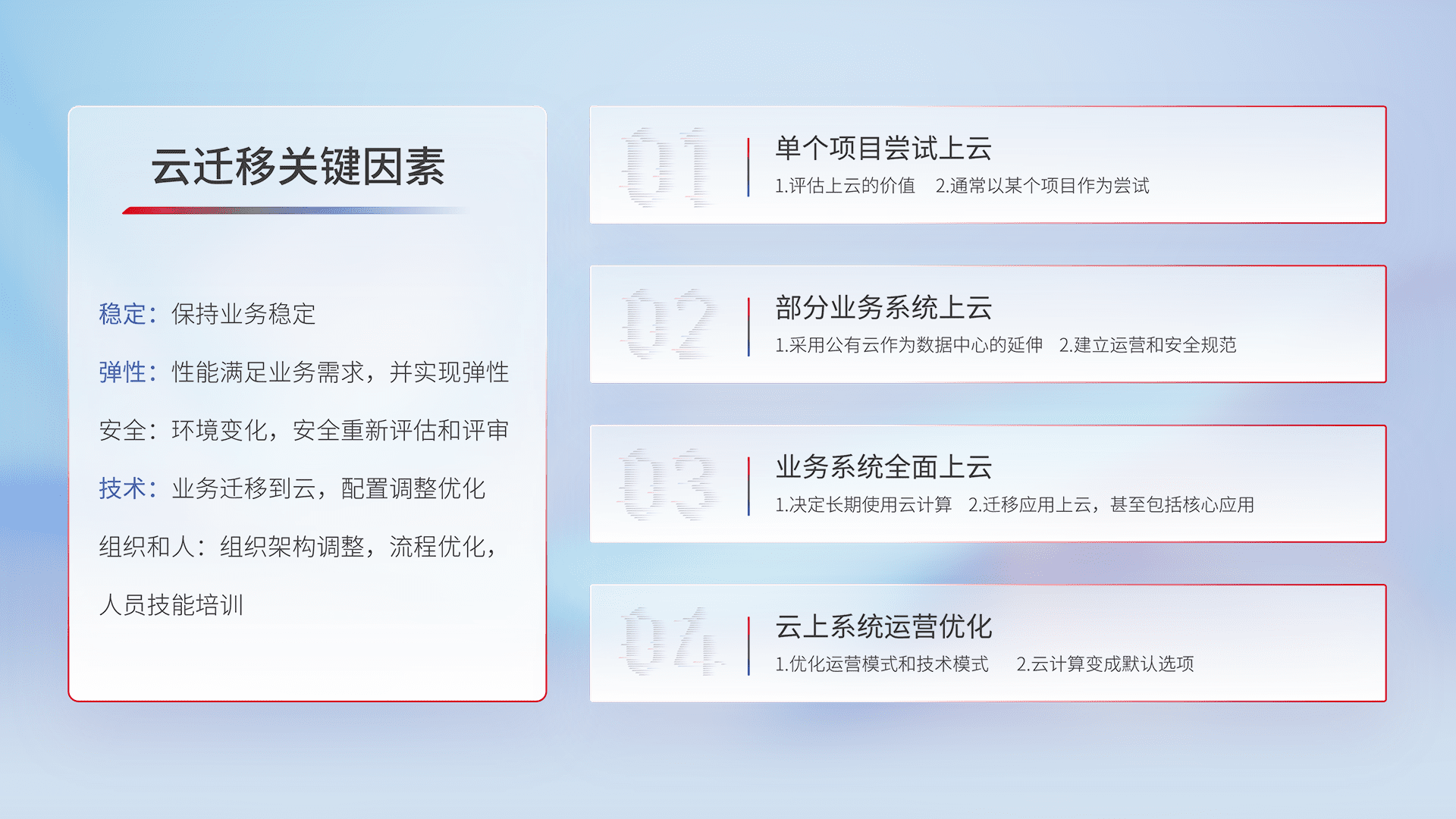 结合实际业务,,,从规划设计、、、、云平台选型、、云原生改造、、数据迁移、、、、集成交付,,迁移全过程为客户识别最佳上云路径,,,做好风险识别管理,,,,设计网络架构、、、身份权限、、、安全审计合规、、、操作审计、、、、日志审计、、、、监控告警策略、、、、多站点容灾设计等,,,,对云上基础设施进行整体规划,,提升IT治理水平,,,以满足弹性、、高可用、、高性能的需求。。。。
