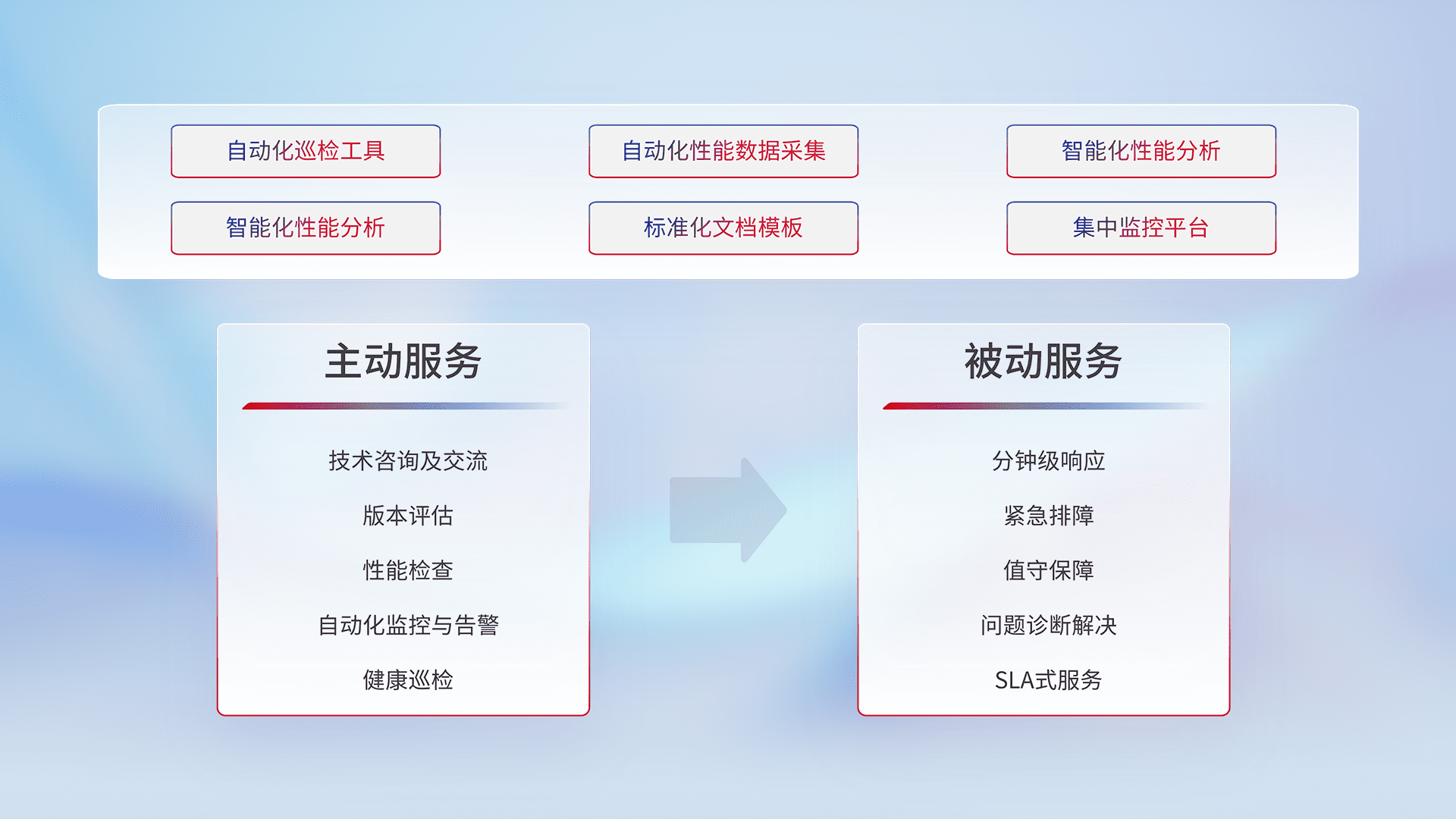 智能化工具和标准化文档,,,保障服务质量,,,提供主动服务(包含技术咨询、、、版本评估、、、性能检查、、、、自动化监控与告警、、、、健康巡检)和被动服务包含(分钟级响应、、、紧急排障、、、值守保障、、问题诊断解决、、SLA服务)。。